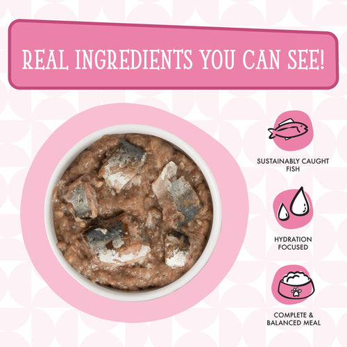 Fish Broth, Salmon, Tuna, Sardine, Mackerel, Sunflower Seed Oil, Locust Bean Gum, Guar Gum, Xanthan Gum, Potassium Chloride, Fish Oil, Choline Chloride, Taurine, Zinc Sulfate, Vitamin E Supplement, Nicotinic Acid (Vitamin B3), Calcium Pantothenate, Thiamine Mononitrate (Vitamin B1), Manganese Proteinate, Vitamin A Supplement, Ferrous Sulfate, Riboflavin Supplement (Vitamin B2), Pyridoxine Hydrochloride (Vitamin B6), Folic Acid, Copper Sulfate, Menadione Sodium Bisulfite Complex (Source Of Vitamin K), Potassium Iodide, Biotin, Vitamin B12 Supplement
