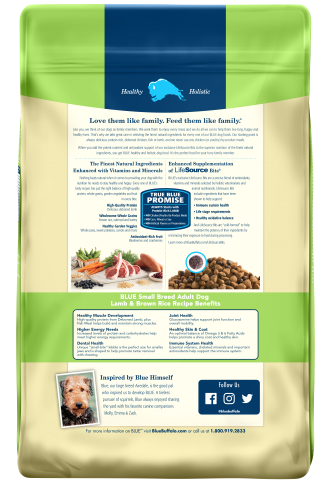 - SMALL BREED DOG FOOD: Specially formulated for the wellness of adult small breed dogs, BLUE Life Protection® Formula Small Breed dry dog food contains increased levels of protein and carbohydrates to meet the energy needs of smaller dogs with a kibble size ideal for smaller jaws.