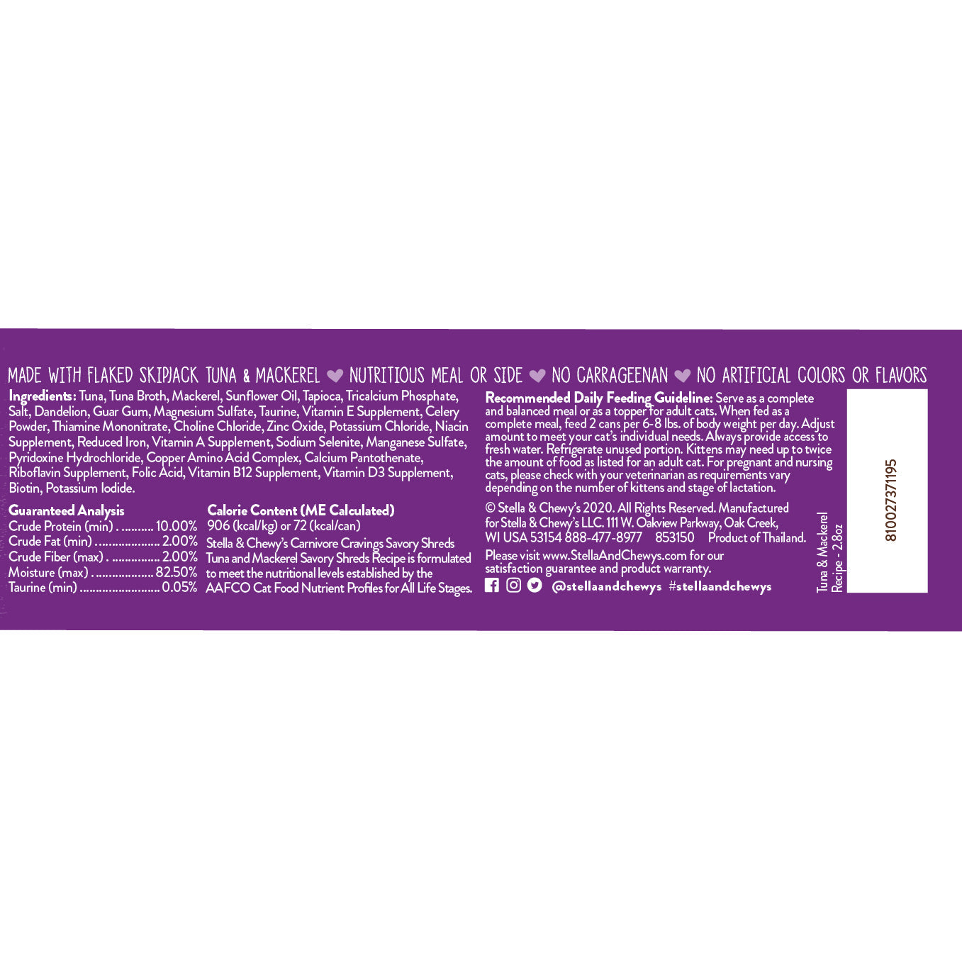 Shredded muscle meat slowly simmered in a savory high-moisture broth to deliver a special meal even the finickiest of cats will love! Give your cat what they naturally crave with the protein-rich nutrition of Stella & Chewy's Carnivore Cravings Savory Shreds.