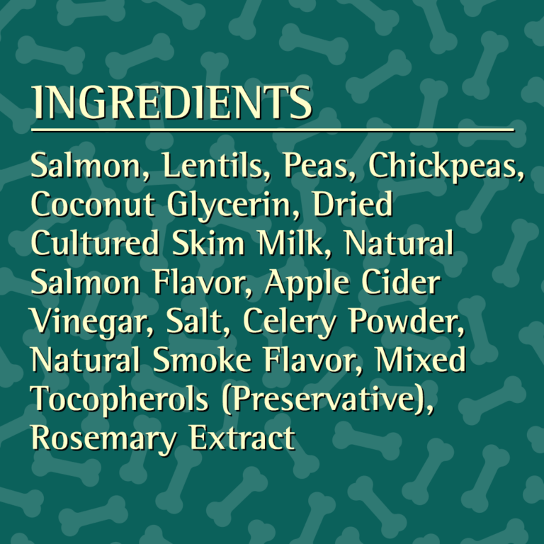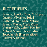 Salmon, Lentils, Peas, Coconut Glycerin, Chickpeas, Dried Cultured Skim Milk, Lactic Acid, Natural Flavor, Apple Cider Vinegar, Celery Powder, Natural Smoke Flavor, Mixed Tocopherols (preservative), Citric Acid (preservative), Rosemary Extract.
